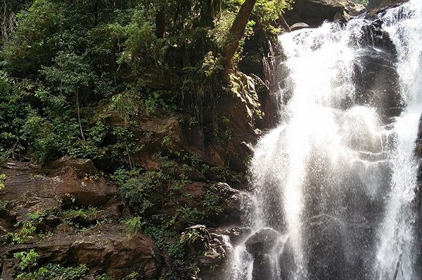 Hanumana Gundi Falls in Kudremukh cascades 100 feet through rocky tiers, lush forest, and serene mist.